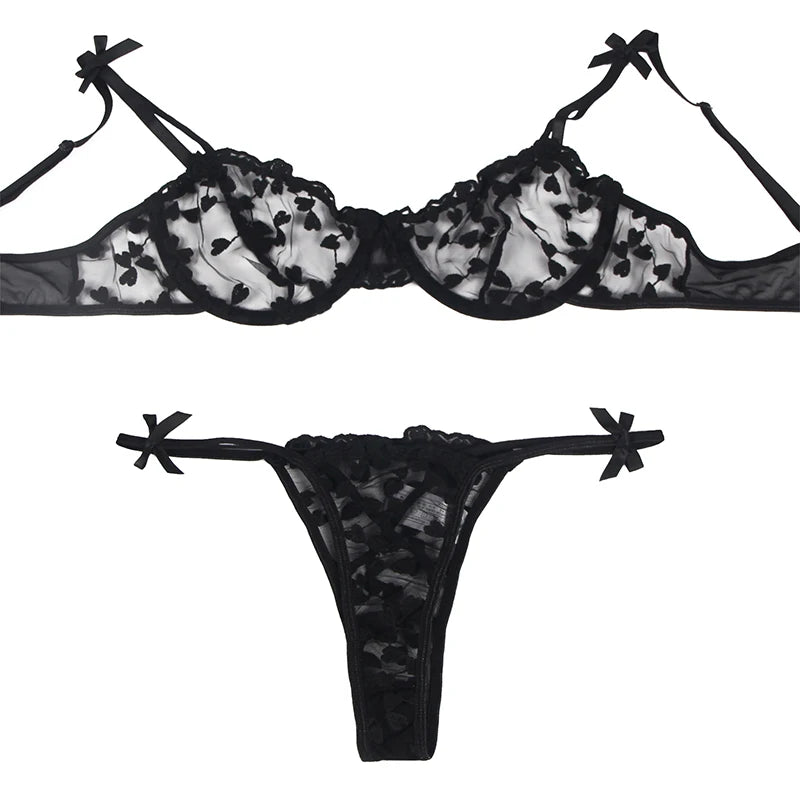 Zmysłowy komplet bielizny z prześwitującej siateczki z haftami o kwiatowym wzorze. Miękki biustonosz z fiszbinami i delikatnymi kokardkami podkreśla biust, a dopasowane stringi dodają całości lekkości i elegancji. Idealny wybór na romantyczne wieczory.