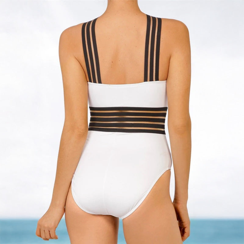 Jednoczęściowy strój kąpielowy z prześwitującymi wstawkami w talii podkreśla sylwetkę i dodaje zmysłowego charakteru. Nowoczesny design łączy elegancję z odrobiną ekstrawagancji.
