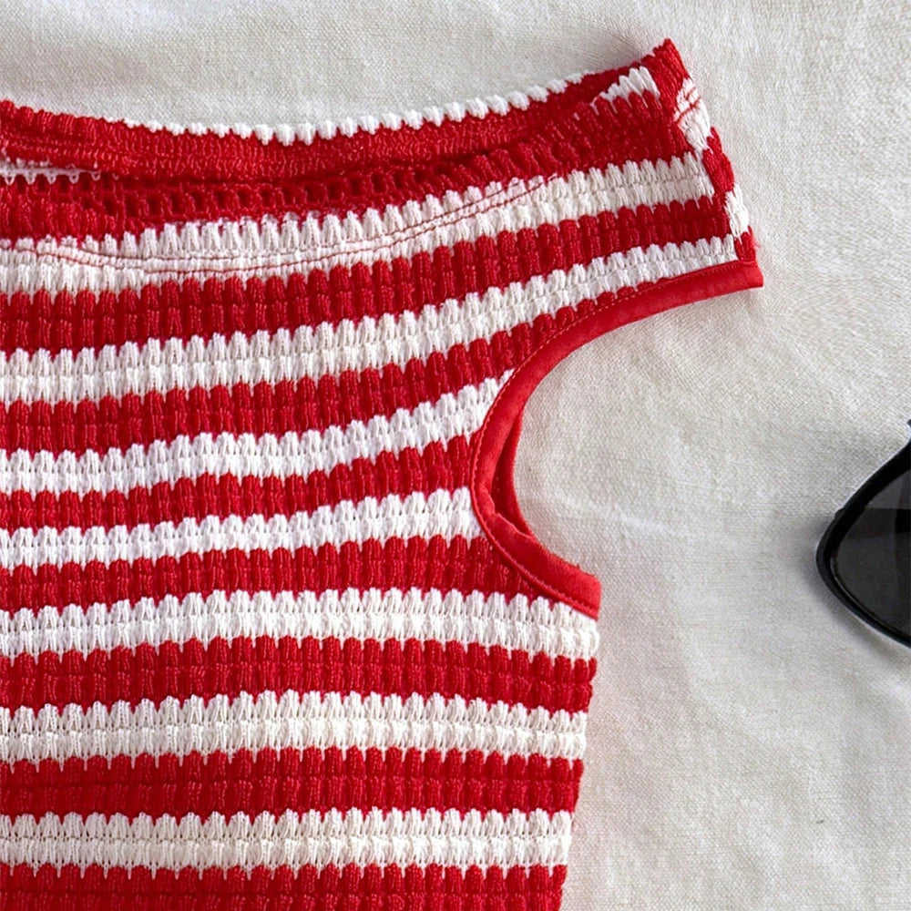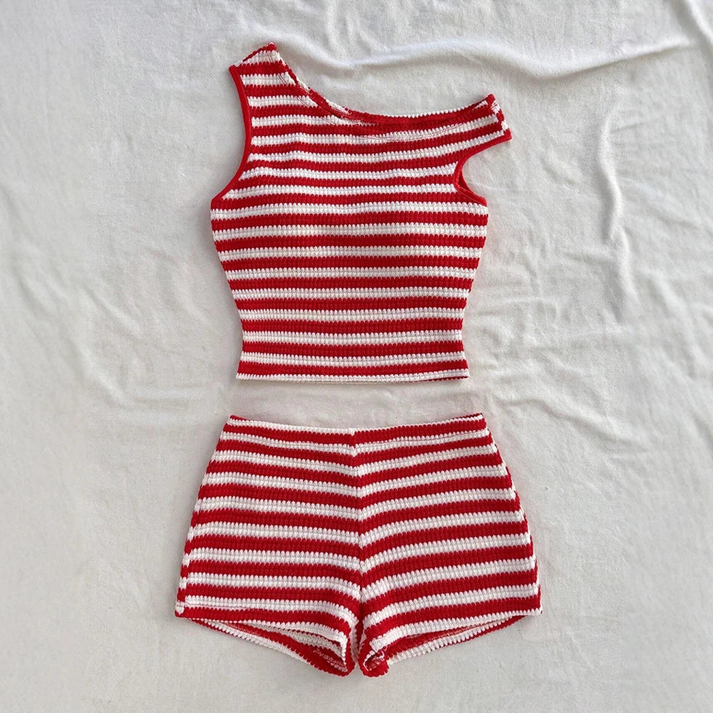 Czerwony letni komplet w paski to stylowa i kobieca propozycja na ciepłe dni. Składa się z krótkich, lekkich szortów z elastycznym pasem oraz topu z jednym opadającym ramiączkiem, który dodaje całości zmysłowego charakteru. Oddychający, przyjemny materiał gwarantuje komfort noszenia, a wakacyjny wzór w paski nadaje świeżości i energii. Idealny zestaw na plażę, spacer lub letnie spotkania.