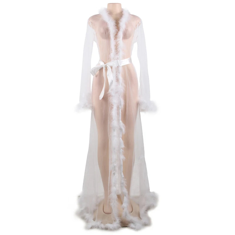 Długa narzutka z transparentnego tiulu, wykończona efektownymi, miękkimi piórami na rękawach i dolnych krawędziach. Elegancki fason do ziemi pięknie podkreśla sylwetkę i nadaje wyjątkowego, luksusowego charakteru. Wiązanie w pasie pozwala na regulację i dopasowanie, eksponując atuty figury.
