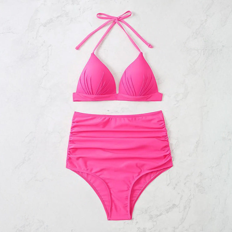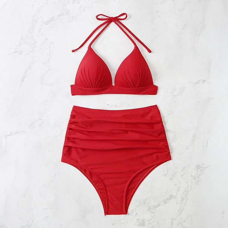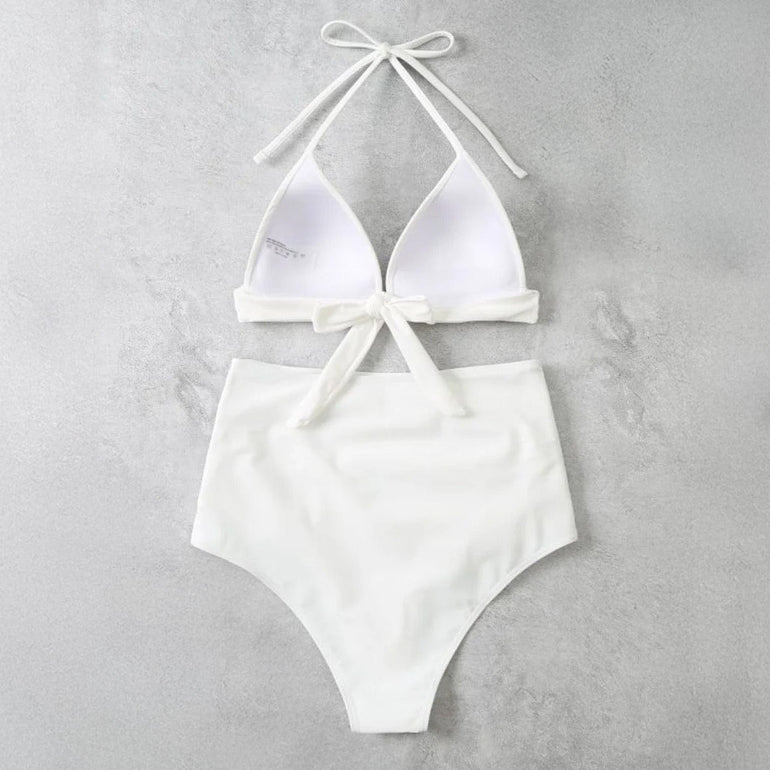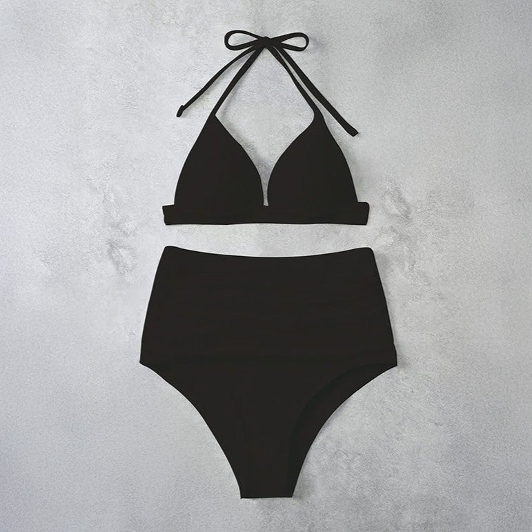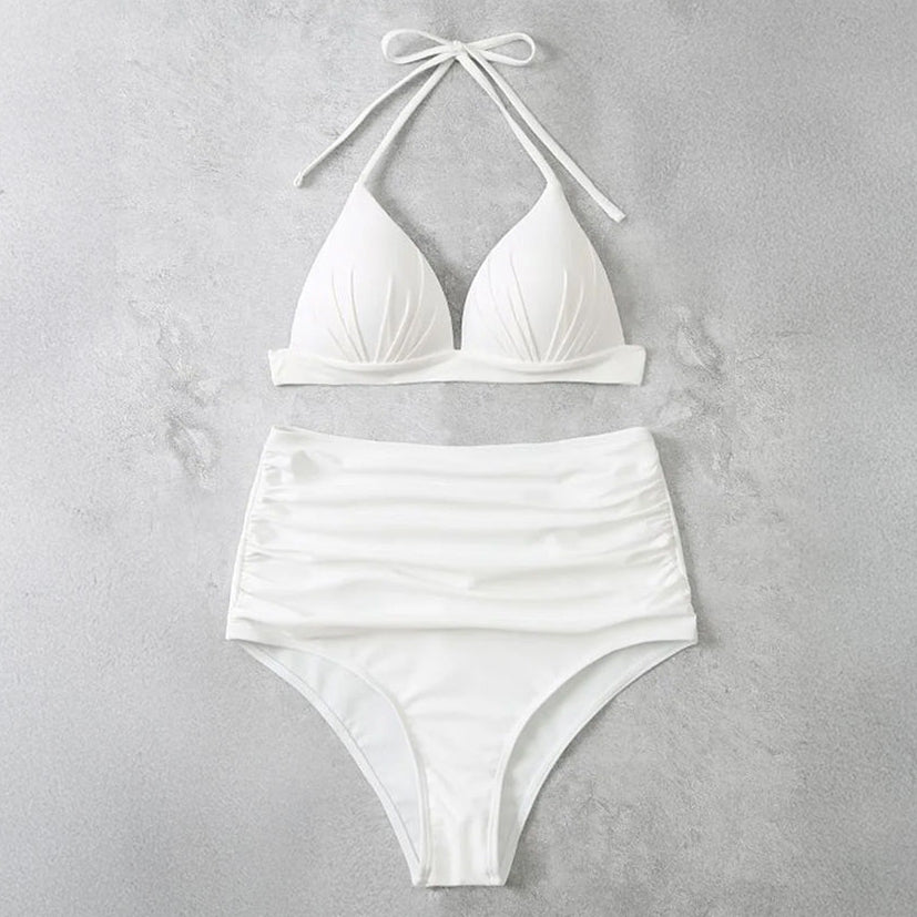 Majtki z wysokim stanem doskonale modelują sylwetkę, podkreślając talię i wysmuklając brzuch. Góra stroju – klasyczny biustonosz, świetnie komponuje się z dolną częścią, tworząc harmonijny i kobiecy look. Idealny wybór na plażę i basen.