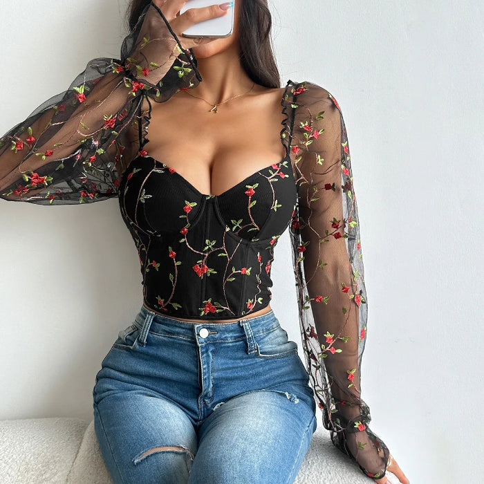 Zachwycający gorsetowy top w stylu romantycznym, z usztywnianym biustem i długimi, tiulowymi rękawami ozdobionymi haftem w kwiaty. Doskonały na wyjątkowe okazje – łączy elegancję, kobiecość i subtelną zmysłowość.