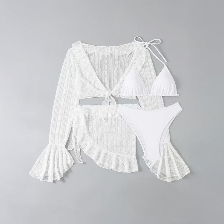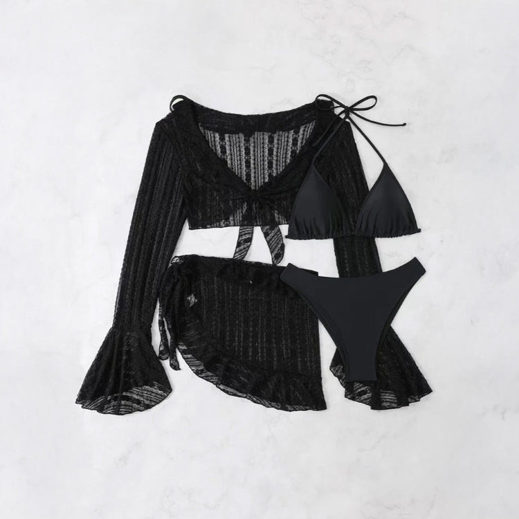 Brązowy zestaw bikini z plażowym, prześwitującym topem i spódniczką to połączenie naturalnych kolorów i lekkiej, zwiewnej formy. Top delikatnie odsłania skórę, a spódniczka dodaje kobiecego uroku. Idealny komplet na plażę, łączący wygodę z modnym, subtelnym stylem na letnie dni.